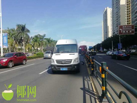 商报全媒体讯(椰网/海拔手机端记者 柯育超)11月18日下午约2时许,海口长堤路西往东方向长堤明珠小区门口附近发生惊险的一幕,一辆大货车因紧急避让前车,撞上道路中间隔离护栏。值得庆幸的是,该起事故未造成人员伤亡,对向车道也无车辆受影响。
